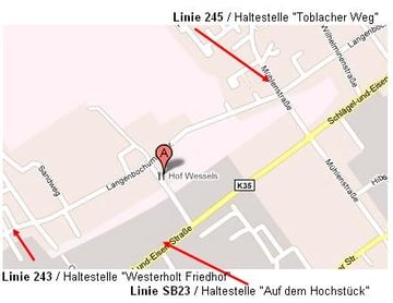 Autobahn A 43, Anschlussstelle Recklinghausen / Herten, Ausfahrt Herten-Nord. Der Autobahnzubringer geht in Herten in die Westerholter Straße über. An der ersten Ampelkreuzung rechts in die Feldstraße einbiegen und dann an der zweiten Ampelkreuzung links die Langenbochumer Straße nehmen. Nach ca. 1.000 m liegt der Hof Wessels auf der linken Seite.