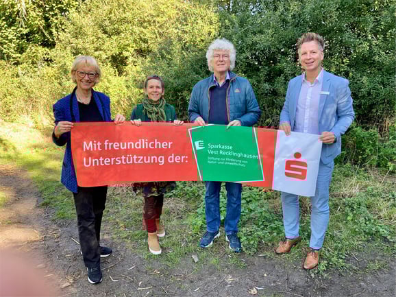 Die 1994 gegründete Stiftung der Sparkasse Vest Recklinghausen zur Förderung des Natur- und Umweltschutzes begleitet seit nunmehr 29 Jahren eine Vielzahl von Projekten und spielt als gemeinnützige Institution im Kreis Recklinghausen eine bedeutsame Rolle. Seit einigen Jahren unterstützt die Sparkassen-Umweltstiftung auch Vorhaben auf dem Hof Wessels in Herten. Der Vorsitzende des Stiftungsvorstandes, Dirk van Buer (re.), sowie Vorstandsmitglied Ulrich Carow (2.v.r.) konnten sich jetzt von dem erfolgreichen Projekt „Geheimnisvoller Randstreifen" auf dem Hof Wessels überzeugen. Hofleiterin Karina Spohr (2.v.l.) und Jutta Haug, Vorsitzende der Hertener Bürgerstiftung, die den Hof Wessels betreibt, erläuterten, wie die von der Sparkasse gestifteten 1000 Euro im Randstreifen rund um das Hofgelände nachhaltige Wirkung zeigen, indem ideale Bedingungen für tierisches und pflanzliches Leben geschaffen wurden. „Hier ist unsere Unterstützung wirklich gut angelegt", freute sich Dirk van Buer.